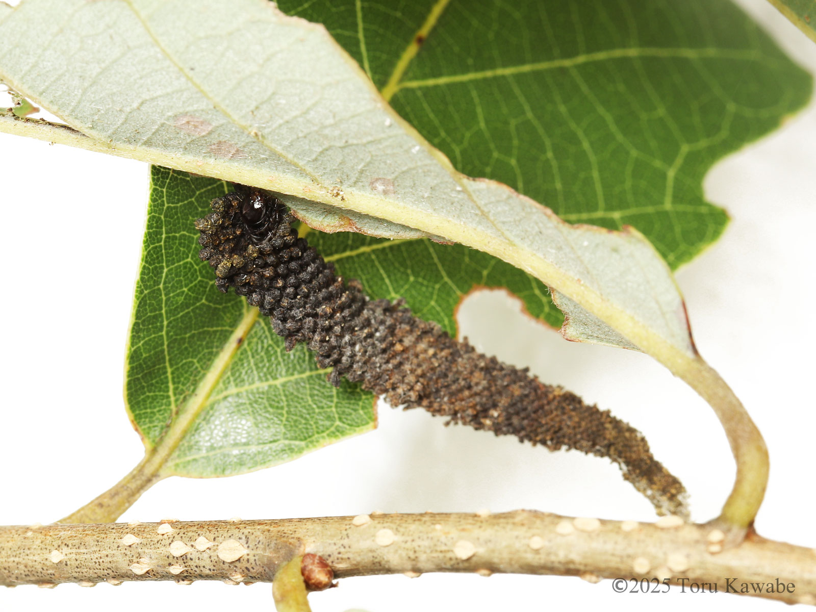 自ら編み上げた携帯巣の中で暮らすツマグロフトメイガの幼虫。時おり顔を覗かせてはコナラの葉を齧る。共に学び合う同志もなく、拠り所となる編み図もなく、己の排泄物のみを材料にして小さな虫の一生を紡いでいく。